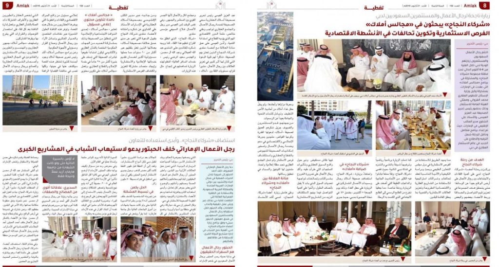 اختتم رجال الأعمال السعوديون والمستثمرون زيارتهم الودية لدبي خلال الفترة من 4-6 أكتوبر الحالي تحت مظلة مجموعة «شركاء النجاح», والمشاركة في برنامج «مجالس أملاك» التي عقدت في الإمارات، بمشاركة وكيل وزارة الإسكان للتطوير العقاري محمد الغزواني، وممثلي الهيئة العامة للاستثمار، وذلك بحضور رئيس تحرير الصحيفة عبد العزيز العيسى، والأستاذ علي الشاوي مدير المكتب الإقليمي في الإمارات، حيث تم إعداد برنامج متكامل وحافل للرحلة شمل الترفيه والاطلاع على الجديد في عالم الاستثمار العقاري في دبي.