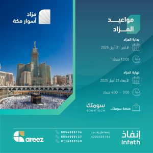 وفي التفاصيل، كشفت الشركة عن مزاد جادة مكة المكرمة الهجين الذي سيقام على منصة سومتك وقاعة الجوهرة بفندق “هوليداي إن” وذلك يوم الأربعاء الموافق 23 أبريل 2025 الساعة الرابعة عصرًا، وتستعرض الشركة فيه 13 فرصة عقارية تتمثل في فلل وعمائر وأراضي سكنية وتجارية متعددة الاستخدامات وبمساحات مختلفة.