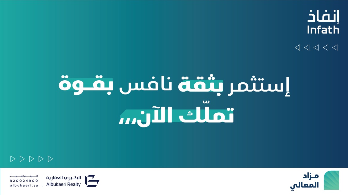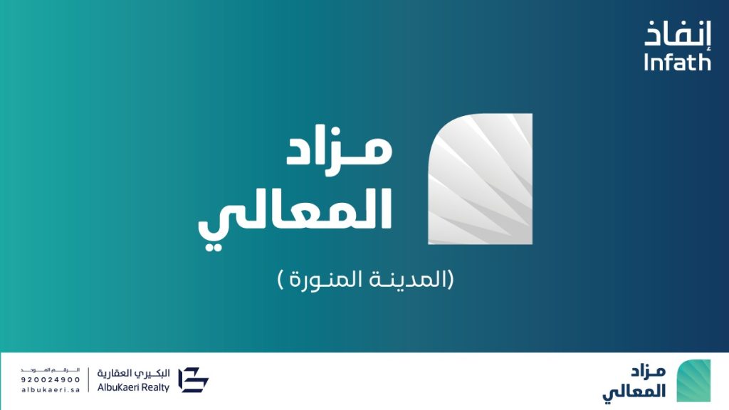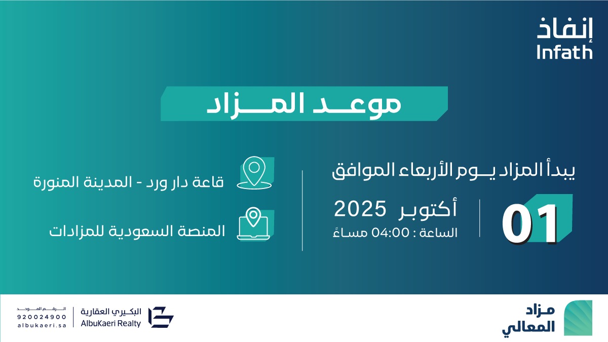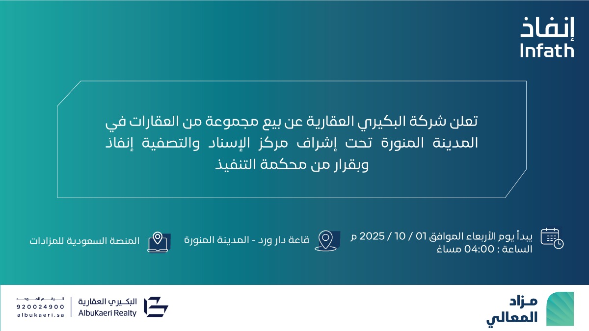 تعلن شركة/ البكيري العقارية وبإشراف مركز الإسناد والتصفية «إنفاذ» وبقرار من محكمة التنفيذ/وبحكم من محكمة الأحوال الشخصية، عن إقامة مزاد “المعالي” / هجين وذلك يوم 01 أكتوبر 2025 / حضوريًا الساعة: 04:00 م في قاعة دار ورد بالمدينة المنورة. / وإلكترونيًا عبر منصة السعودية للمزادات.