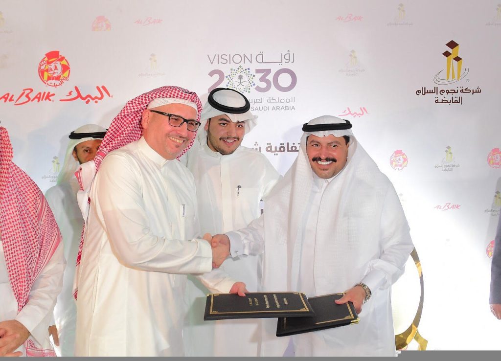 وقع عن شركة نجوم السلام القابضة رئيس مجلس الإدارة د.جارالله العضيب، فيما وقّع الاتفاقية عن “البيك” الرئيس التنفيذي، المهندس رامي بن شكور أبو غزالة, وتمثل الاتفاقية شراكة إستراتيجية في مجال استثمار الأراضي وإقامة المشاريع الحيوية، وتوفير المواقع الجغرافية لمطاعم البيك على مستوى المملكة.