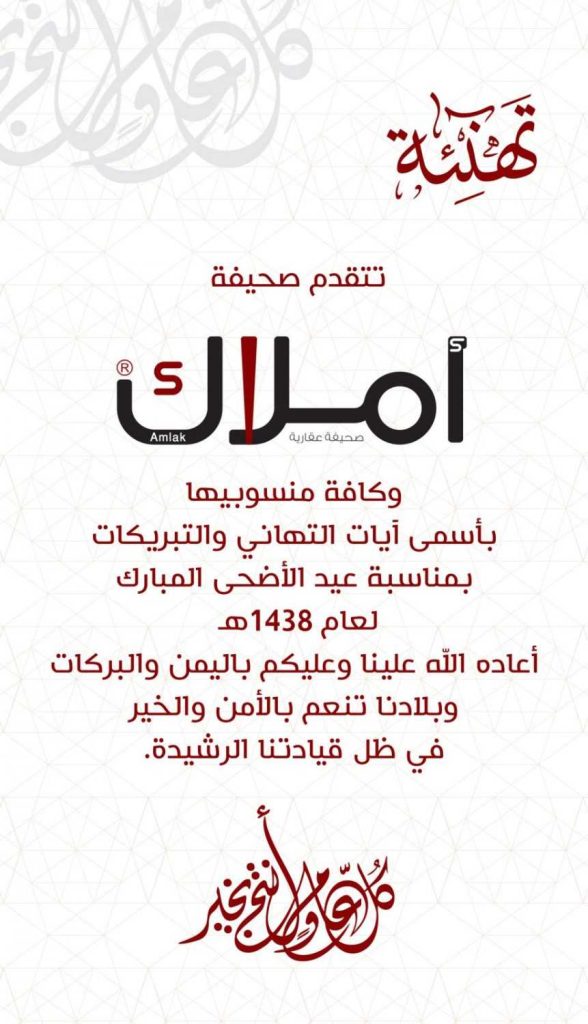 تتقدم صحيفة أملاك العقارية وكافة منسوبيها بأسمى آيات التهاني والتبريكات لعملائها وقرائها الكرام بمناسبة عيد الأضحى المبارك لعام 1438هـ, أعاده الله علينا وعليكم باليمن والبركات, وبلادنا تنعم بالأمن والخير في ظل قيادتنا الرشيدة.