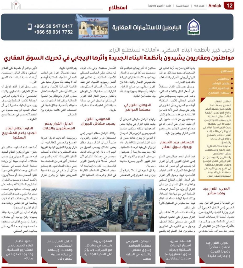 استقبل القطاع العقاري بصفة عامة والمواطنون بصفة أخص بارتياح كبير تعديل أنظمة البناء للمباني السكنية حتى يستفيد المواطن من المساحة التي يمتلكها؛ بحيث تكون نسبة البناء في الدور الأرضي 70 % (كحد أقصى)، وذلك بالسماح بالبناء في الارتدادات والملاحق.