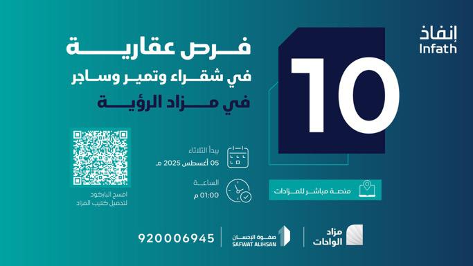 كما تنظم شركة صفوة الإحسان المزاد الثالث تحت عنوان مزاد “الرؤية”، ‏لبيع 10 فرص عقارية (سكنية، تجارية، زراعية) ‏بمواقع استراتيجية في ‏شقراء وتمير وساجر عبر منصة مباشر للمزادات، وذلك في يوم الثلاثاء 5 أغسطس 2025 في الساعة الواحدة مساءً.