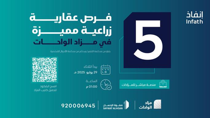 ويأتي المزاد الأول تحت اسم مزاد “الواحات” العلني الإلكتروني، لبيع 5 فرصة عقارية زراعية مميزة بمواقع استراتيجية في الخرج، والدلم عبر منصة مباشر للمزادات، وذلك يوم الثلاثاء 29/07/2025 في الساعة الواحدة ظهرًا، وحتى يوم الخميس 31 يوليو 2025.