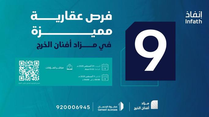 بينما يحمل المزاد الرابع اسم مزاد “أفنان الخرج” العلني الإلكتروني ‏لبيع ٩ فرص عقارية مميزة بمواقع استراتيجية في الخرج والدلم ‏عبر منصة مباشر للمزادات، يوم السبت 9 أغسطس 2025 في الساعة الواحدة ظهرًا وينتهي يوم الاثنين 11 أغسطس 2025 ما بين الساعة الثانية إلى الرابعة مساءً.
