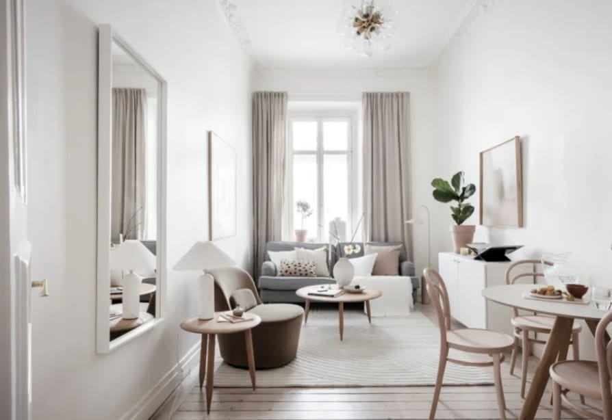 تلعب الألوان الفاتحة دورًا كبيرًا في توسيع الشعور بالمساحة في الشقق الصغيرة. يعكس استخدام الألوان الفاتحة مثل الأبيض والألوان الباستيلية الضوء بشكل أفضل، مما يجعل الغرف تبدو أكبر وأكثر إشراقًا. بالإضافة إلى ذلك، يمكن استخدام المرايا بشكل استراتيجي لخلق انطباع بالعمق والمساحة. توضع المرايا عادةً مقابل النوافذ لتعكس الضوء الطبيعي وتزيد من إشراق الغرف.