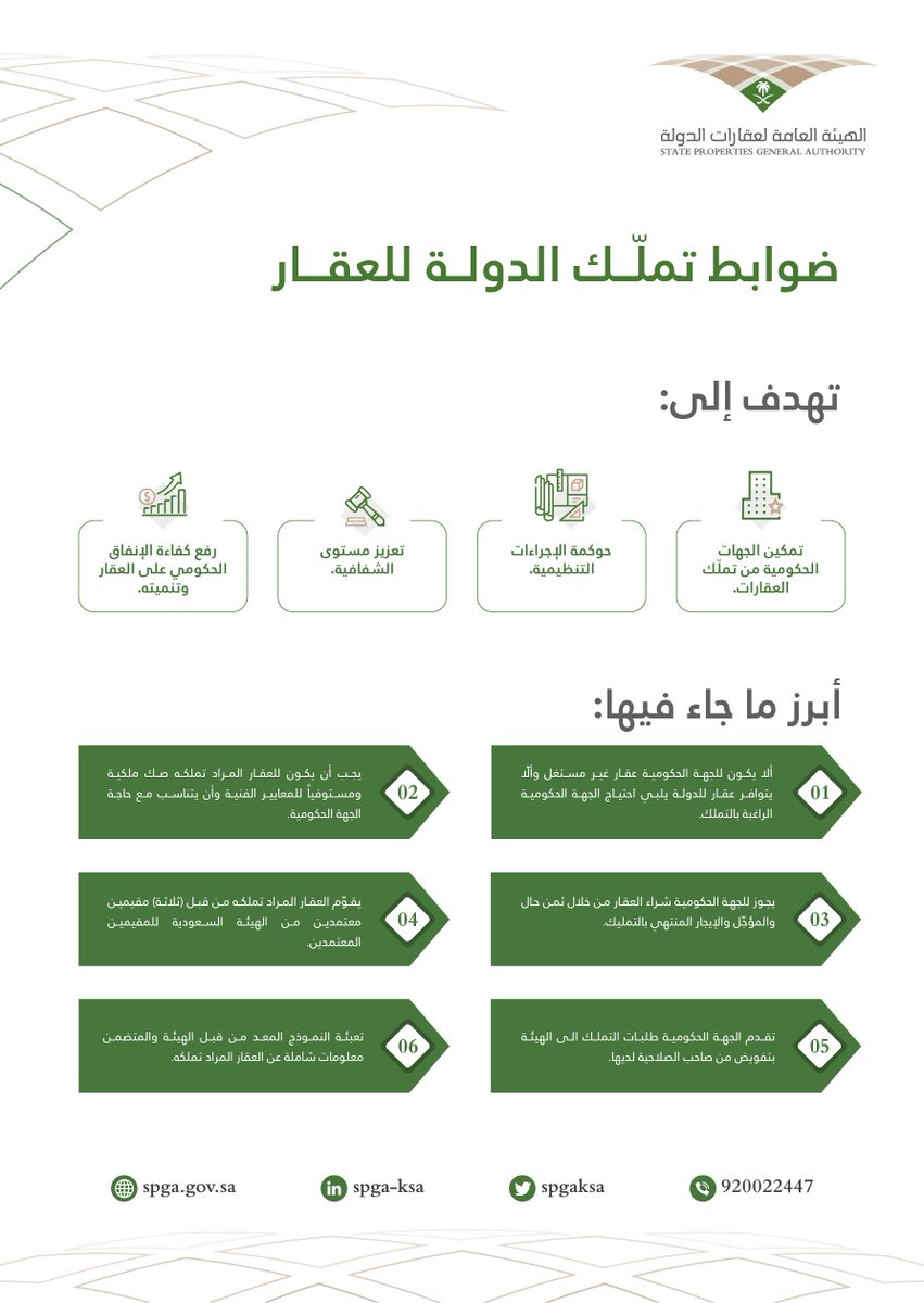 وقالت الهيئة إنّ أحكام ضوابط تملك الدولة للعقار تسري على طلبات تملك العقار المقدمة من الجهات الحكومية داخل المملكة، حيث تضمنّت 22 مادة اختصت بـ: “أنواع التملك، وإجراءاته، واستقبال العروض، والأحكام المنظّمة لذلك”.