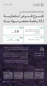 أعلنت وزارة الصناعة والثروة المعدنية طرح فرص استثمارية لـ 12 رخصة لـ محاجر مواد البناء، للمنافسة في مجمع كسارات محافظة جدة الجديد بمنطقة مكة المكرمة، الواقع على بعد 20 كيلومتراً تقريباً شرق محافظة جدة ، مبينة أن الرخص المطروحة للمنافسة تشمل: 5 رخص خام بحص، و7 رخص مواد ردميات، وستتلقى الوزارة الطلبات ابتداءً من 30 يناير حتى 16 فبراير من العام الجاري.