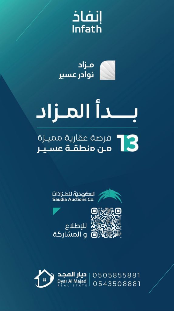 ويعد المزاد فرصة مثالية للمستثمرين والراغبين في امتلاك عقارات ذات مواقع متميزة في منطقة عسير، حيث يتيح المزاد خيارات متنوعة تناسب مختلف الميزانيات والاحتياجات العقارية. كما يمكن للراغبين في المشاركة التسجيل عبر منصة السعودية للمزادات وسداد قيمة الدخول للمزاد، وهي قابلة للاسترداد.
