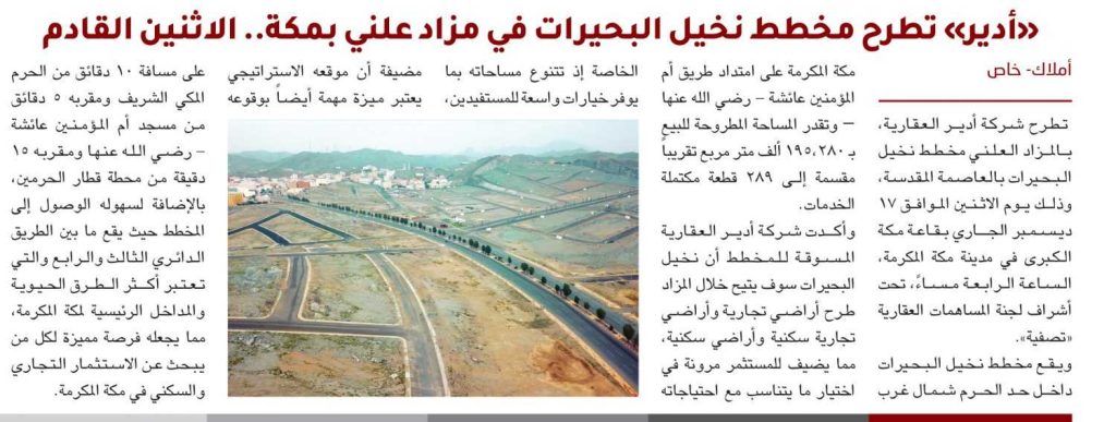 تطرح شركة أدير العقارية، بالمزاد العلني مخطط نخيل البحيرات بالعاصمة المقدسة، وذلك يوم الاثنين الموافق 17 ديسمبر الجاري بقاعة مكة الكبرى في مدينة مكة المكرمة، الساعة الرابعة مساءً، تحت أشراف لجنة المساهمات العقارية «تصفية» ويعد المخطط إضافة في عقارات مكة المكرمة الحديثة