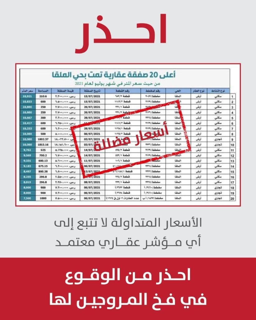 نفى عدد من المختصين والمهتمين بالقطاع العقاري صحة المؤشر العقاري المتداول لأسعار الأراضي بأحد أحياء الرياض، مؤكدين أنها أرقاماً مغلوطة لا تتبع لمؤشرات وزارة العدل، معتبرين الأسعار الذي تضمنها الجدول المتداول مبالغ فيها ولا تعكس الواقع، حيث يمكن للراغبين في الاطلاع على أسعار العقارات وتفاصيل الصفقات زيارة موقع وزارة العدل الدي يوفر جميع الصفقات التي تمت سواء على مستوى الأحياء او على مستوى المدن.