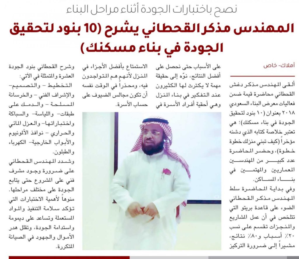 ألقى المهندس مذكر دغش القحطاني محاضرة قيمة ضمن فعاليات معرض البناء السعودي 2018 بعنوان (10 بنود لتحقيق الجودة في بناء مسكنك)؛ هي تعتبر خلاصة كتابه الذي دشنه مؤخراً (كيف تبني منزلك خطوة خطوة), وحضر المحاضرة عدد كبيــر من المهندسـين المعماريين والمهتمين في بناء المساكن.