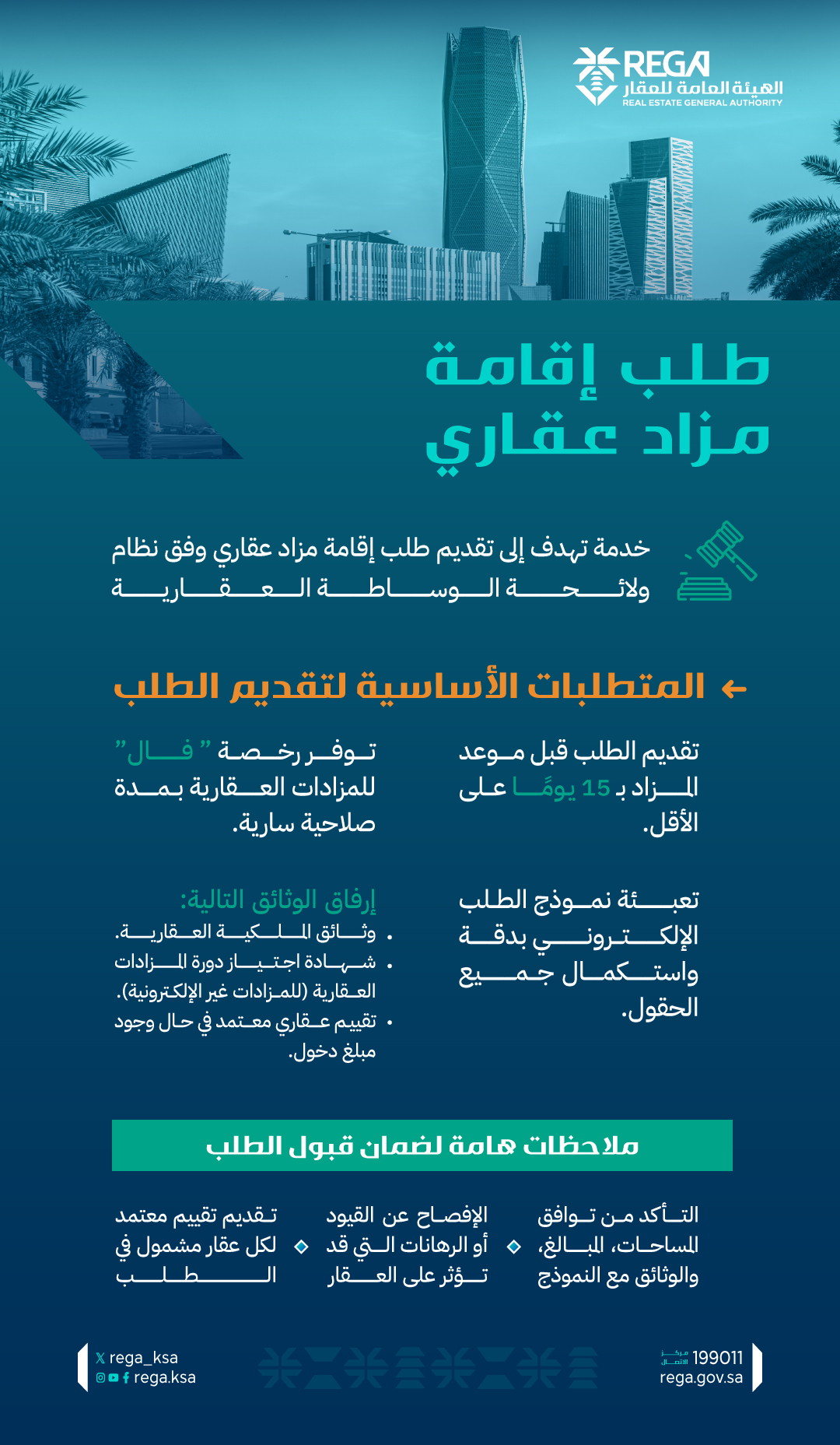 كشفت الهيئة العامة للعقار، عن متطلبات طلب إقامة مزاد عقاري، وهي الخدمة التي تهدف إلى تنظيم سوق المزادات، وفق نظام الوساطة العقارية ولائحته التنفيذية.