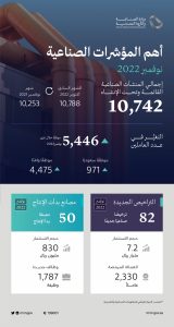 وكشف التقرير الصادر عن المركز الوطني للمعلومات الصناعية والتعدينية التابع للوزارة عن إجمالي عدد التراخيص الصناعية التي أصدرتها الوزارة منذ مطلع العام 2022 حتى نهاية شهر نوفمبر الماضي بلغ 885 ترخيصاً، بينما وصل عدد المصانع القائمة في المملكة حتى نهاية الشهر نفسه 10742 مصنعاً، بحجم استثمارات بلغ 1.419 تريليون ريال.