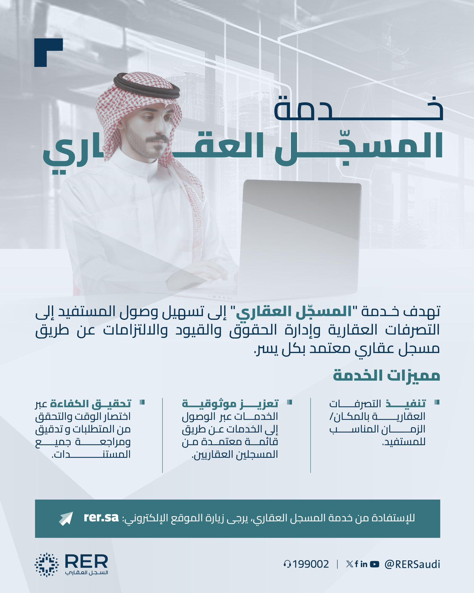 ويأتي إطلاق خدمة المسجل العقاري ضمن جهود السجل العقاري في تمكين التحول في القطاع العقاري من خلال تطبيق أفضل الممارسات العالمية في العقار، وتقديم خدمات رقمية مبتكرة وموثوقة تسهل رحلة المستفيدين وتعزز كفاءة واستدامة القطاع العقاري.