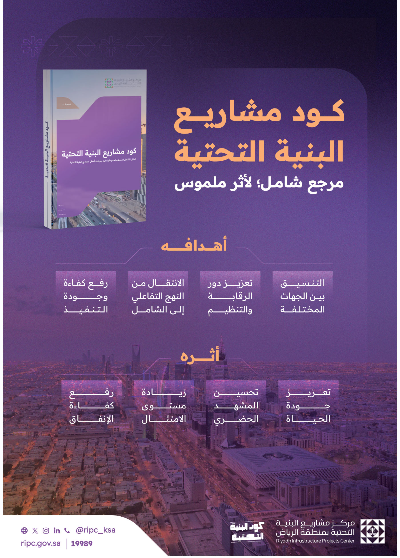 أطلق مركز مشاريع البنية التحتية بمنطقة الرياض “كود مشاريع البنية التحتية” بوصفه نموذجًا رائدًا وفريدًا من نوعه، وذلك بهدف وضع معايير موحدة تسهم في رفع جودة وسلامة الأعمال، وتعزيز تنسيق وتكامل الجهود بين جميع الجهات ذات العلاقة، ويشمل ذلك الجهات الحكومية، والمقاولين، والاستشاريين، والمختبرات، ومزودي الخدمات، ويدخل حيز التنفيذ في شهر أغسطس 2025.