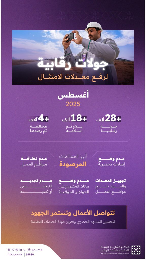 نفّذ مركز مشاريع البنية التحتية بمنطقة الرياض خلال شهر أغسطس 2025م، أكثر من (28) ألف جولة رقابية على أعمال المشاريع في مدينة الرياض ومحافظات المنطقة، فيما استقبل أكثر من (18) ألف بلاغ عن أعمال مخالفة، ورصد أكثر من (4) آلاف مخالفة لضوابط واشتراطات مشاريع البنية التحتية.