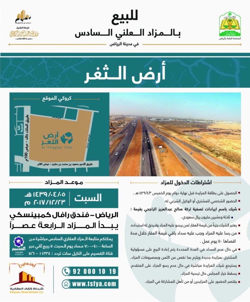 يواصل مجلس تصفية تركة الشيخ صالح الراجحي, رحمه الله, وبالتعاون مع شركة إتقان العقارية المسوق الحصري للتركة, طرح مزاداته حيث ينظم عصر اليوم السبت 23 ديسمبر المزاد السادس حيث ستتم المزايدة بين المتقدمين على أهم الفرص العقارية والاستثمارية على مستوى السوق العقاري السعودي (أرض الثغر) في حي حطين شمال العاصمة الرياض, وذلك تحت إشراف المحكمة العامة بالرياض, وذلك في تمام الساعة 4عصراً بفندق رافال كمبينسكي بمدينة الرياض.