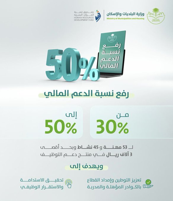 أعلنت وزارة البلديات والإسكان، اليوم الأحد، عن رفع نسبة الدعم المالي في منتج دعم التوظيف من 30% إلى 50%، وذلك بالتعاون مع صندوق تنمية الموارد البشرية “هدف”.