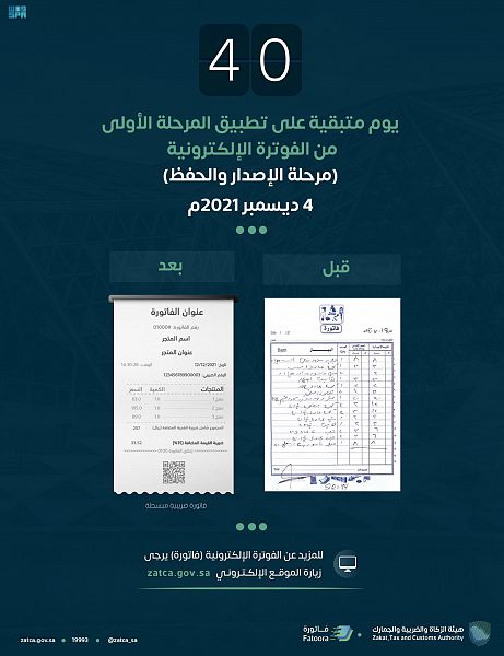 دعت هيئة الزكاة والضريبة والجمارك مكلفيها الخاضعين للائحة الفوترة الإلكترونية، إلى المسارعة في الاستعداد اللازم لتهيئة منشآتهم بمتطلبات المرحلة الأولى، والمتبقي عليها 40 يومًا، حيث ستدخل حيز التنفيذ في 4 ديسمبر 2021م.