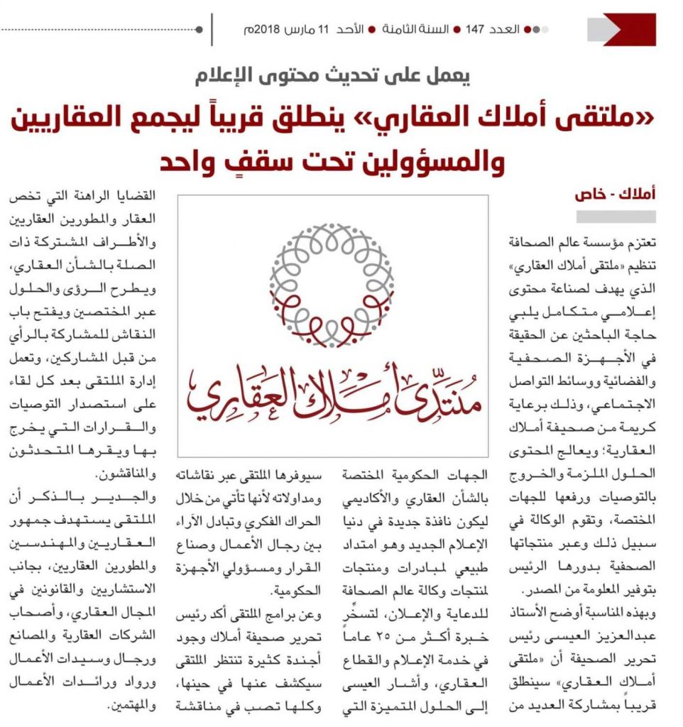 وبهذه المناسبة أوضح الأستاذ عبدالعزيز العيسى رئيس تحرير الصحيفة أن «ملتقى أملاك العقاري» سينطلق قريباً بمشاركة العديد من الجهات الحكومية المختصة بالشأن العقاري والأكاديمي ليكون نافذة جديدة في دنيا الإعلام الجديد وهو امتداد طبيعي لمبادرات ومنتجات لمنتجات وكالة عالم الصحافة للدعاية والإعلان، لتسخِّر خبرة أكثر من 25 عاماً في خدمة الإعلام والقطاع العقاري, وأشار العيسى إلى الحلول المتميزة التي سيوفرها الملتقى عبر نقاشاته ومداولاته لأنها تأتي من خلال الحراك الفكري وتبادل الآراء بين رجال الأعمال وصناع القرار ومسؤولي الأجهزة الحكومية.