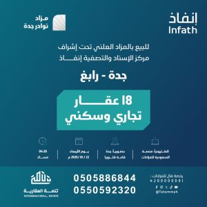 تعلن شركة تتمة العقارية بإشراف مركز الإسناد والتصفية «إنفاذ» وبقرار من محكمة التنفيذ وحكم من محكمة الأحوال الشخصية، عن إقامة مزاد “نوادر جدة” الهجين وذلك يوم الأربعاء 22 أكتوبر 2025 الموافق 30 ربيع ثاني 1447 عند الساعة 4:30 عصرًا، حضورياً في قاعة قلوريا بمدينة جدة، مع إتاحة المشاركة إلكترونيًا عبر المنصة السعودية للمزادات.