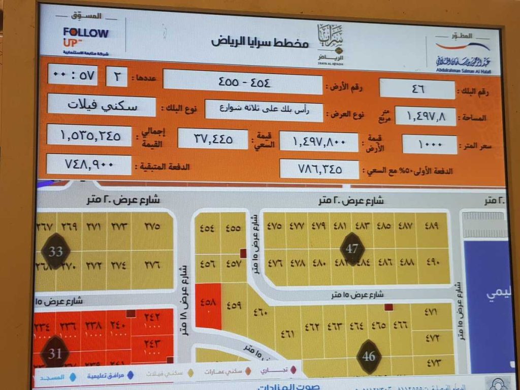 في بداية المزاد بيع 9 بلوكات بالكامل وتبلغ مساحتها  90.311. متر مربع , بقيمة 1000 ريال للمتر المربع. وتم بيع بلوك رقم واحد وهو يحتوي على قطعتين  ويمثل بداية المخطط ويعتبر أغلى بلوك لأنه يقع على موقع استراتيجي بطريق الملك فهد وشارع جمال الدين أبو المكارم وشارع عرضي بسعر 2350 للمتر المربع.