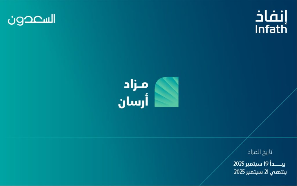 تعلن شركة السعدون العقارية وبإشراف مركز الإسناد والتصفية «إنفاذ» وبقرار من محكمة التنفيذ وبحكم من محكمة الأحوال الشخصية، عن إقامة مزاد «أرسان» إلكتروني وذلك من يوم الجمعة 19/9/2025 الساعة 1 مساء حتى يوم الأحد 21/9/2025 الساعة: 8:00 مساء عبر منصة وصلت للمزادات.