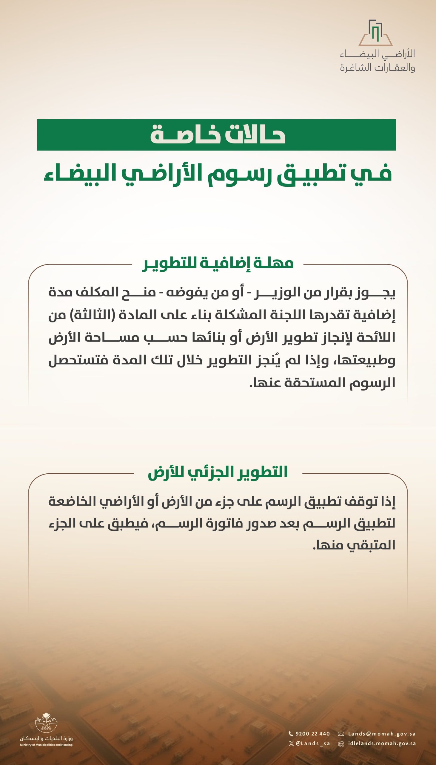 يجوز بقرار من الوزير أو من يفوضه منح المكلف مدة إضافية يقدّرها اللجنة المختصة وفقًا للمادة الثالثة من اللائحة، وذلك لاستكمال تطوير الأرض أو بنائها، على أن تُراعى مساحة الأرض وطبيعتها في تحديد المهلة. وفي حال عدم إنجاز التطوير خلال المدة المحددة، تُحصّل الرسوم المستحقة عن الأرض.
