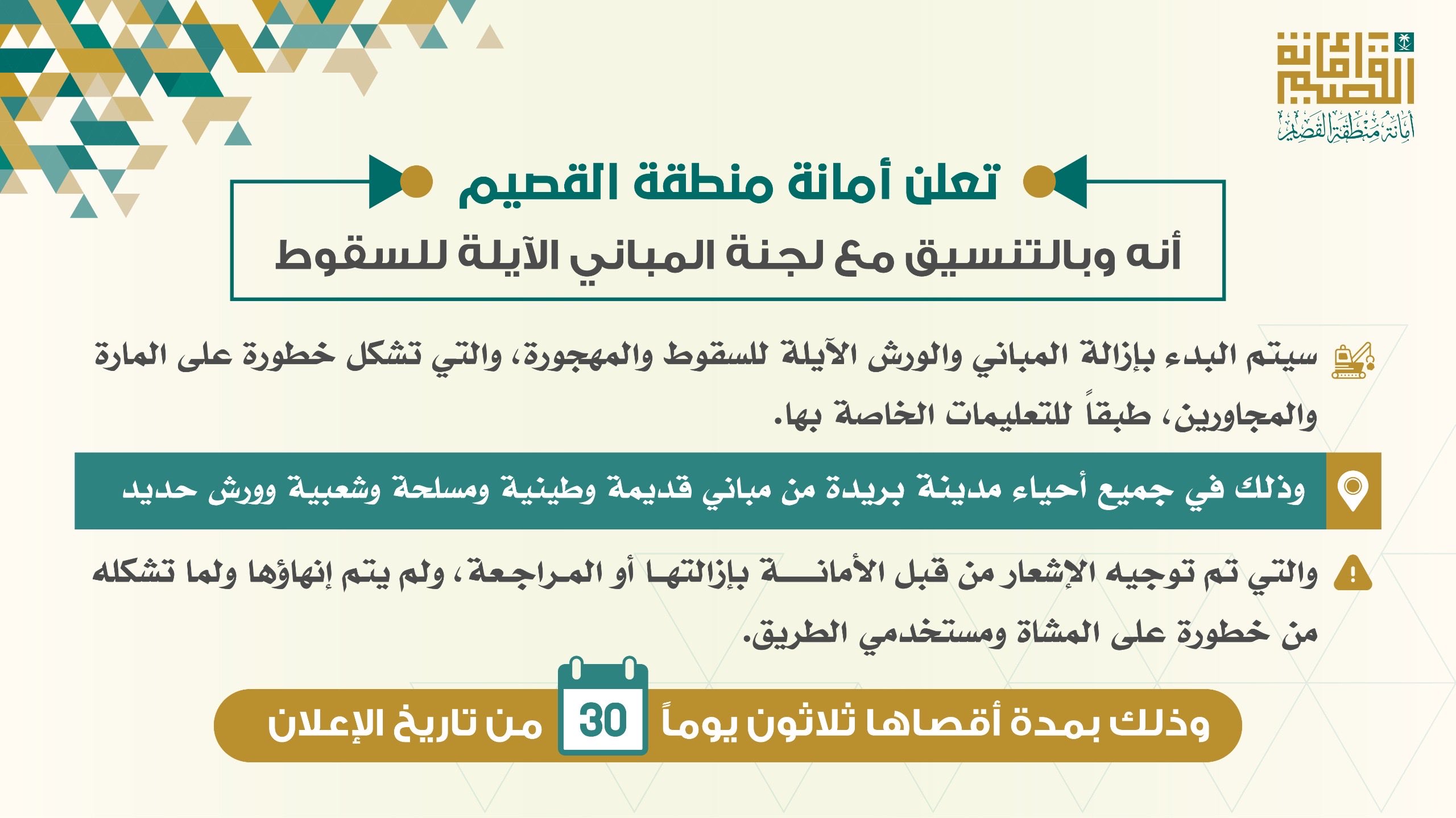 وأوضحت الأمانة أن القرار جاء نظرًا لما تمثله هذه المباني من مخاطر على المارة والسكان المجاورين، مؤكدة أن تنفيذ أعمال الإزالة سيتم خلال مدة لا تتجاوز 30 يومًا من تاريخ الإعلان.