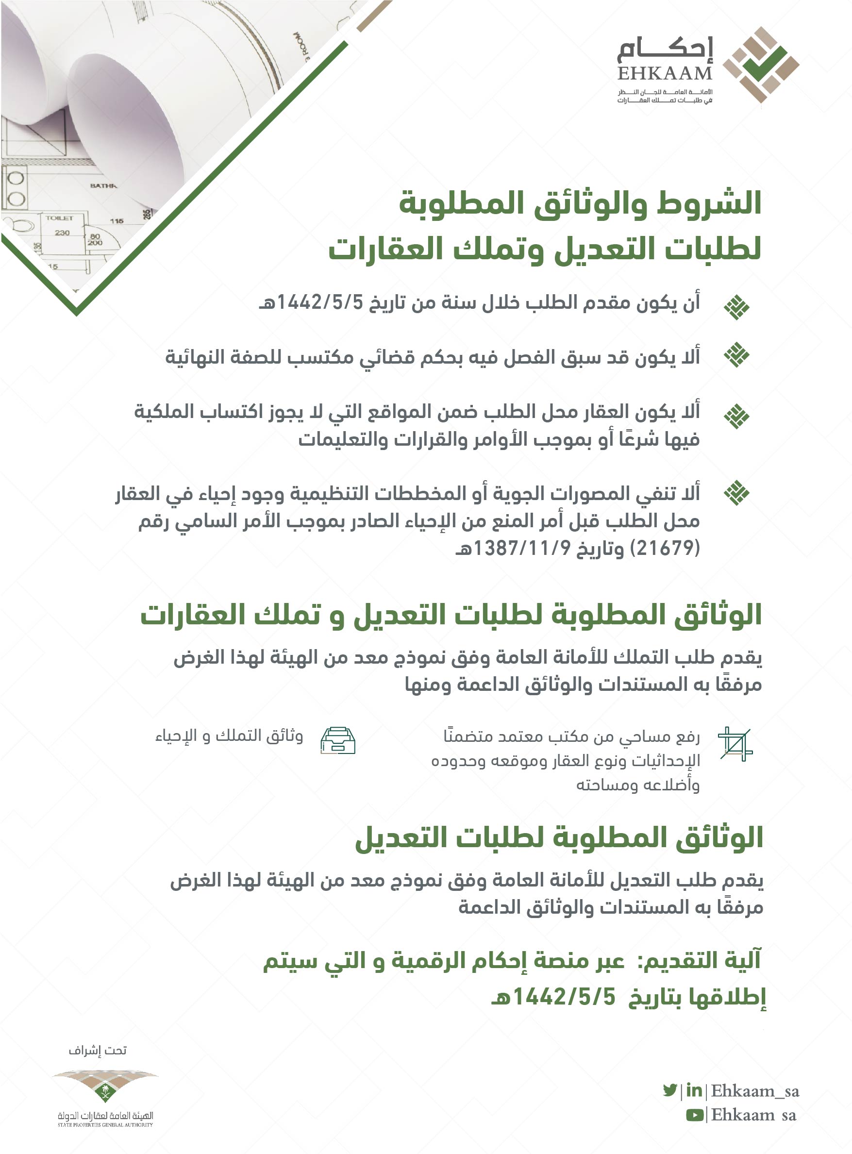 تستعد الأمانة العامة للجان النظر في طلبات تملك العقارات (إحكام) لإغلاق باب التقديم على طلبات تملك العقارات في المدن والمحافظات بعد 88 يوما. وأكدت أن لجان النظر تختص بطلبات التملك للعقارات المحياة قبل أمر المنع الصادر في 1387/11/9هـ.