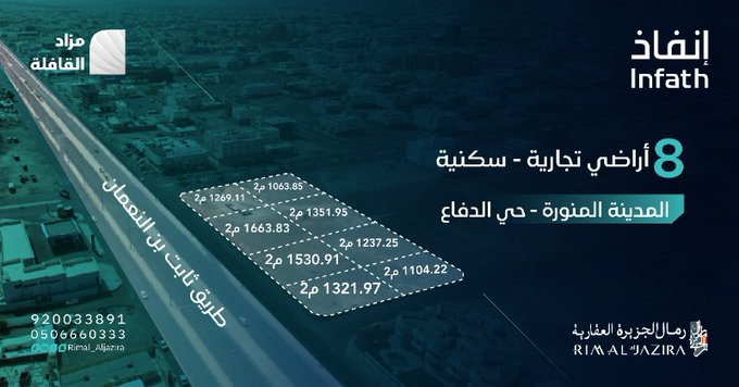ويضم المزاد (8) أراضي بحي الدفاع خمسة منها تجارية سكنية وثلاثة سكنية على طريق ثابت بن النعمان، بمساحاتٍ متنوعة تبدأ من ألف متر مربع، ويقع العقار بالقرب من أهم الطرق الرئيسية بالمدينة المنورة شمالًا الإمام مسلم، شرقًا طريق الأمير نايف بن عبد العزيز، وغربًا طريق الملك سعود.