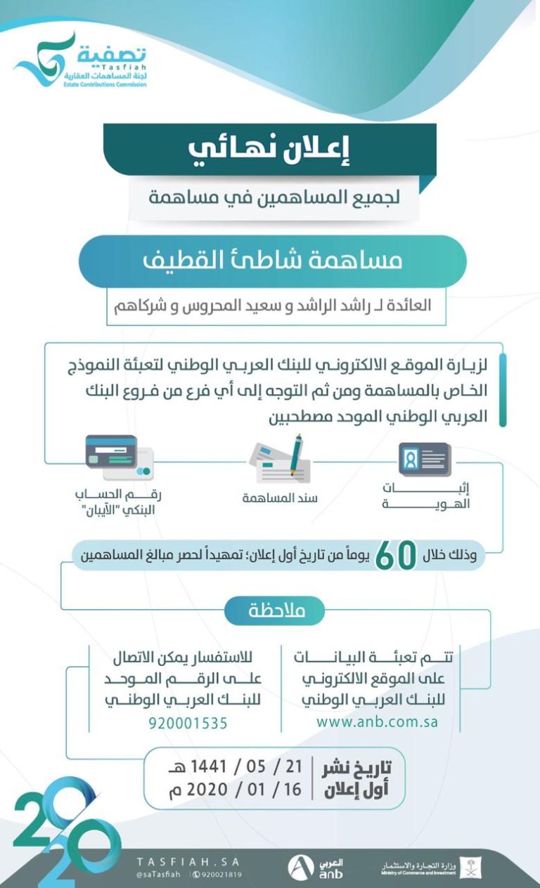 لجنة المساهمات العقارية “تصفية” تحدد منتصف مارس آخر موعد لمراجعة مساهمي “شاطئ القطيف” الموقع الإلكتروني للبنك العربي