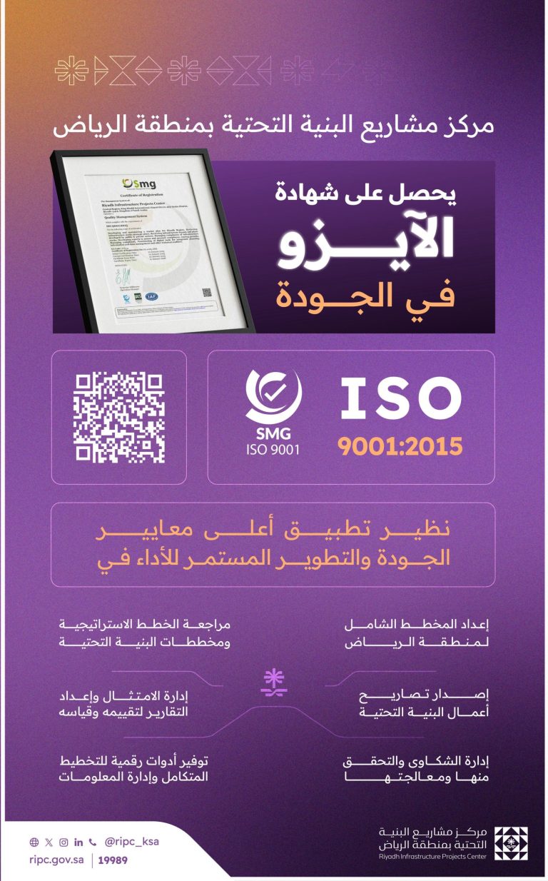 وقت القرائه: < 1 دقيقةحصل مركز مشاريع البنية التحتية بمنطقة الرياض على شهادة “ISO 9001:2015″، تقديرًا لجهوده في تطبيق ...