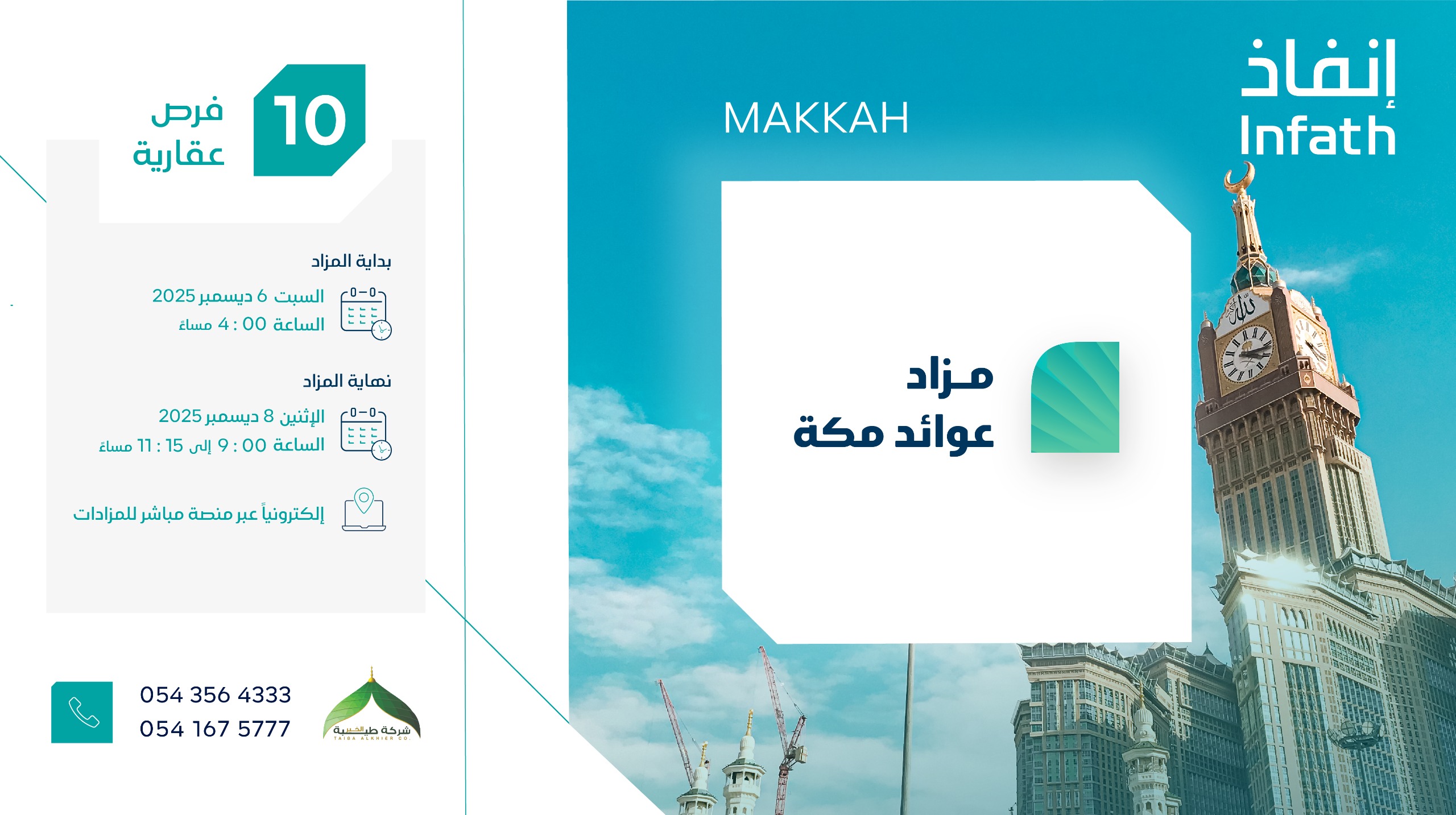 وقت القرائه: < 1 دقيقةتعلن شركة طيبة الخير للمزادات وبإشراف مركز الإسناد والتصفية « إنفاذ » وبقرار من محكمة التنفيذ ومحكمة الأحوال الشخصية ، عن إقامة مزاد “عوائد مكة الإلكتروني” وذلك يوم السبت بتاريخ 06-12-2025م الساعة : 04:00 مساء حتى يوم الإثنين بتاريخ 08-12-2025م من الساعة: 09:00 مساء حتى الساعة : 11:15 مساء إلكترونيًا عبر منصة مباشر للمزادات . … إقرأ المزيد